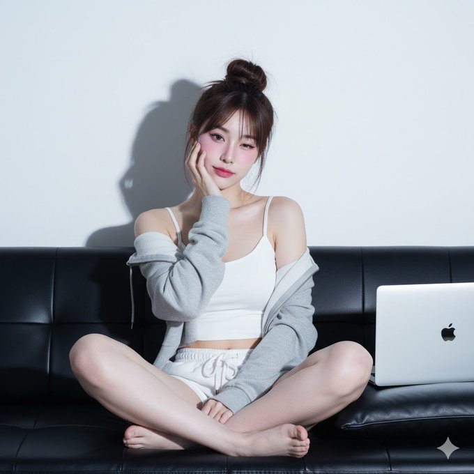 画面采用直射闪光灯照明,营造出高调明亮、高对比度的效果,在白色墙壁上投下清晰的阴影,皮肤和沙发上有明显的高光。旁边放着一台银色MacBook笔记本电脑。照片经过高度后期处理,皮肤光滑无瑕,没有毛孔或瑕疵,眼睛和睫毛部分锐化,整体色调明亮、干净,略带冷色,粉色调突出。构图是垂直的,主体居中,从大腿中部到头部。